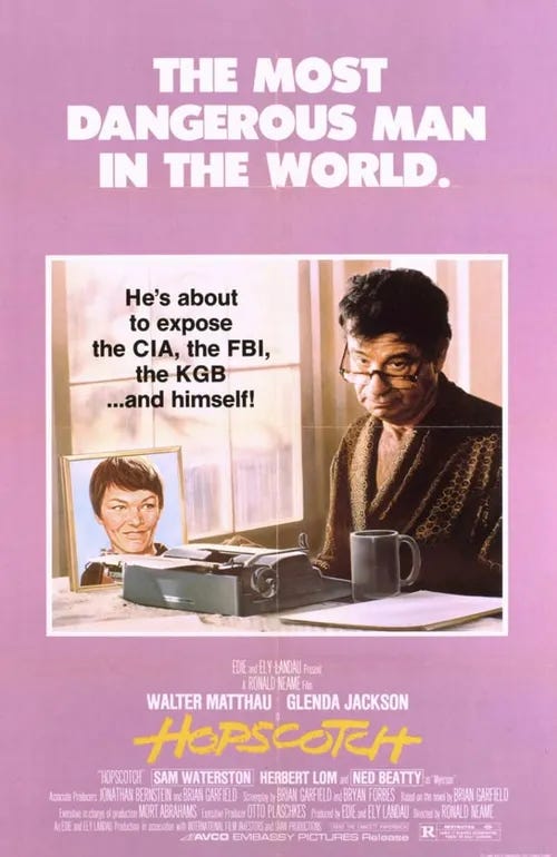 So on Wednesday, I began to make good on that resolution. I turned on the television and went to YouTube and scoured through comedies. The newer ones seemed silly and base, and I finally settled on something I’d never seen before from 1980. Hopscotch, starring Walter Matthau, Glenda Jackson, Ned Beatty, Sam Waterston, and Herbert Lom was described as a comedy spy film.
